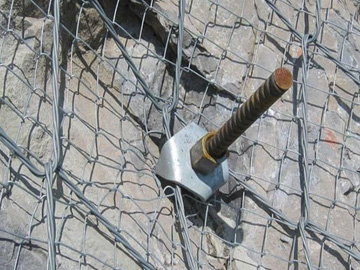 輔助錨桿:選用件。用于在局部低凹處使SPIDER網更好地緊貼坡面,相對于主要錨桿,其直徑可約小,一般為20~25mm,長度一般選用1~1.5m,其錨墊板亦可適當減小。