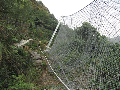 由鋼絲繩網(wǎng)、環(huán)形網(wǎng)、(需攔截小塊落石時(shí)附加一層鐵絲格柵)、固定系統(tǒng)(錨桿、拉錨繩、基座和支撐繩)減壓環(huán)和鋼柱四個(gè)主要部分構(gòu)成。鋼柱和鋼絲繩網(wǎng)連接組合構(gòu)成一個(gè)整體,對(duì)所防護(hù)的區(qū)域形成面防護(hù),從而阻止崩塌巖石土體的下墜,起到邊坡防護(hù)作用。