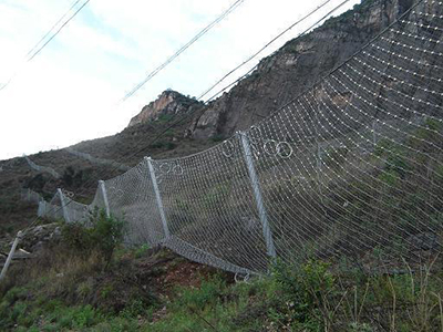 被動(dòng)邊坡防護(hù)網(wǎng)是由鋼絲繩網(wǎng)、環(huán)形網(wǎng)、(需攔截小塊落石時(shí)附加一層鐵絲格柵)、固定系統(tǒng)(錨桿、拉錨繩、基座和支撐繩)減壓環(huán)和鋼柱四個(gè)主要部分構(gòu)成。鋼柱和鋼絲繩網(wǎng)連接組合構(gòu)成一個(gè)整體,對(duì)所防護(hù)的區(qū)域形成面防護(hù),從而阻止崩塌巖石土體的下墜,起到邊坡防護(hù)作用。